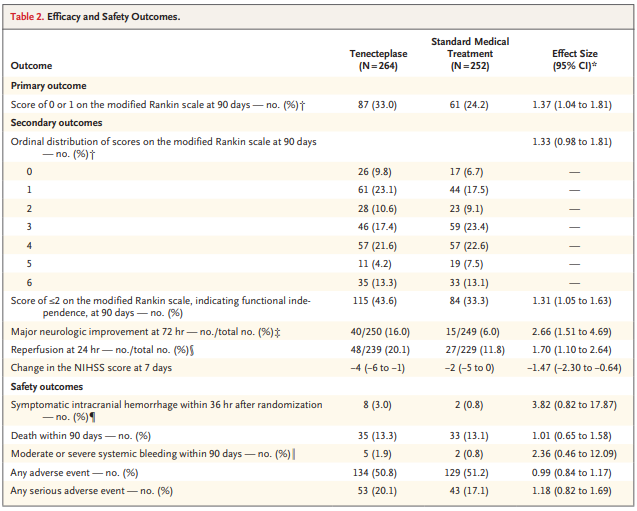 A porcentagem de pacientes que não apresentaram incapacidade (definida como uma pontuação na escala de Rankin modificada de 0 ou 1) em 90 dias (o resultado primário) foi de 33,0% no grupo tenecteplase em comparação com 24,2% no grupo de tratamento padrão (taxa relativa, 1,37; intervalo de confiança [IC] de 95%, 1,04 a 1,81; P = 0,03). A porcentagem de pacientes que eram funcionalmente independentes (definidos como uma pontuação de escala de Rankin modificada de ≤2) em 90 dias foi de 43,6% no grupo tenecteplase e 33,3% no grupo de tratamento padrão (taxa relativa, 1,31; IC de 95%, 1,05 a 1,63). A recanalização completa em 24 horas após o tratamento ocorreu em 69 pacientes (27,9%) no grupo tenecteplase e em 14 pacientes (5,9%) no grupo de tratamento padrão.