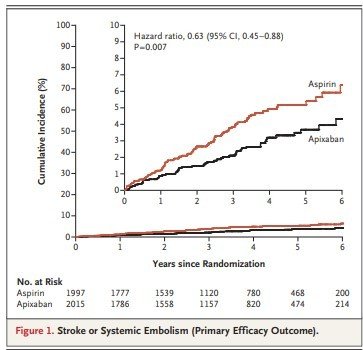 AVC ou embolia sistêmica (resultado primário de eficácia) ocorreu em 55 pacientes designados para receber apixabana (0,78% por paciente-ano) e 86 pacientes designados para receber aspirina (1,24% por paciente-ano) (taxa de risco, 0,63; intervalo de confiança de 95% [IC], 0,45 a 0,88; P=0,007), sendo que o risco de sangramento maior foi de 1,71% por paciente-ano com apixabana e 0,94% por paciente-ano com aspirina (taxa de risco, 1,80; IC 95%, 1,26 a 2,57; P = 0,001). Então o que podemos concluir?
